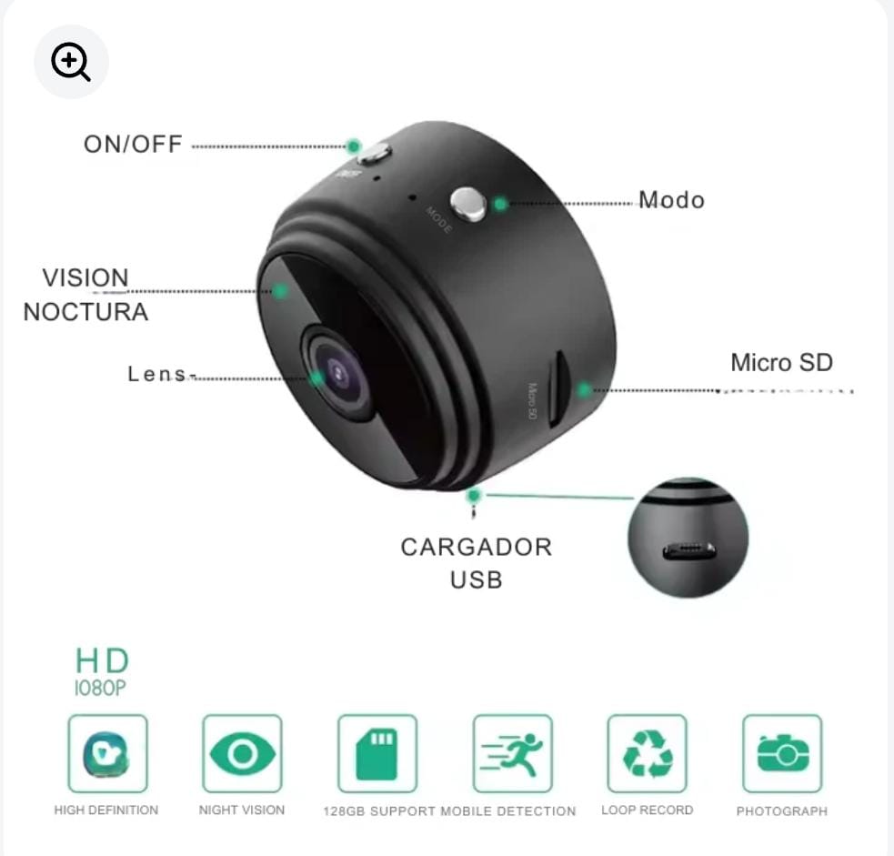 CAMARA WIFI CIRCULAR 1080P / BATERIA INTERNA (USO BATERIA EXTERNA OPCIONAL) / NO REQUIERE INTERNET PARA USO / SOPORTE MAGNETICO / AUDIO BIDIRECCIONAL / 43*35*25MM